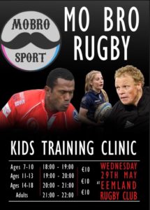 Het seizoen mag dan bijna voorbij zijn, het rugbyweer wordt er niet minder om. Gelukkig kun je nog even doorgaan! We hebben nog iets heel leuks binnenkort; Mo Bro Rugby geeft eind mei clinics op verschillende plekken in Nederland. Wij hebben ze weten te strikken voor de Woensdag 29 mei,  (zie poster onderaan). Naar Eemland komen Steffan Basson ( Ex Springbok 7s Captain ), Earl Rose ( Ex Springbok 7s player ) & Anton Kriel (Ex South Africa Player).